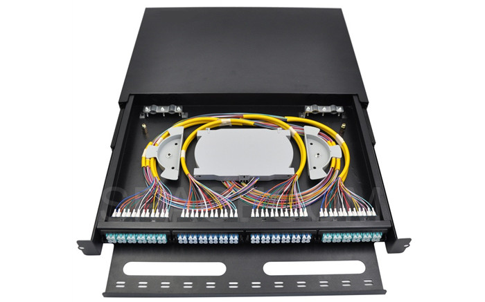 96 core LC single mode pull-out fiber distribution frame, pull-out module design, made of cold rolled steel plate, anti-static epoxy spray, flexible application, stable performance, safety and faster. It contains 4 groups of 24 core LC adaptive panels and